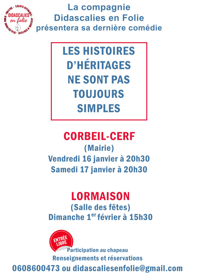 Nous sommes en cours d'écriture de notre prochaine comédie qui sera présentée en janvier 2027 à Andeville, puis à Corbeil-Cerf, mais également à Lormaison.